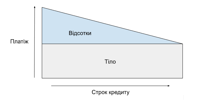 Диференційована схема погашення — це коли ваш щомісячний платіж з часом зменшується, але перші платежі помітно вищі ніж за ануїтетним графіком. Тут ви постійно платите одну й ту ж саму суму щомісяця для виплати тіла кредиту, а ось частка відсотків поступово зменшується: за перший місяць ви з одного платежу сплатите близько 50% відсотків, тоді як за останній — 0–5%. Такий кредит передбачає нижчу переплату, але й вищі платежі.