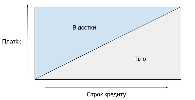 Ануїтетна схема погашення кредиту — це коли ваш щомісячний платіж протягом всього терміну кредитування однаковий. Сам платіж тут спершу складається з більшої міри відсотків і лише частково тіла кредиту, а наприкінці строку — навпаки.