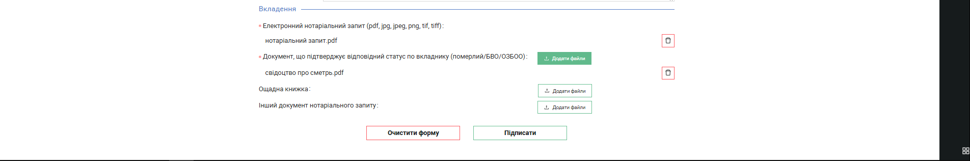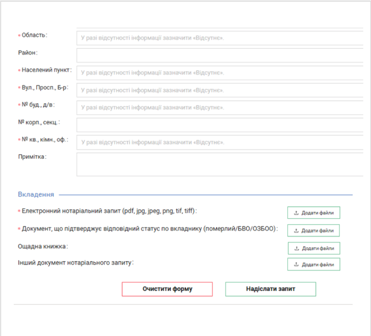 Крок 3. Після введення необхідних даних додати у вкладення файл текстунотаріального запиту та документ, що підтверджує відповідний статус клієнта (померлий/БВО/ОЗБОО) і натиснути клавішу «Надіслати запит»