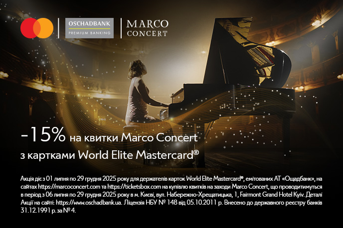 Придбайте квитки на сайтах https://marcoconcert.com/ та https://ticketsbox.com/, розрахуйтесь Вашою карткою Mastercard World Elite Ощадбанку та гарантовано отримайте знижку 15%.