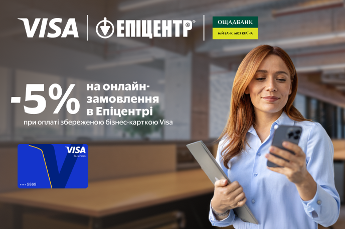 - 5% знижки на онлайн-покупки в Епіцентрі при оплаті збереженою корпоративною карткою Visa.