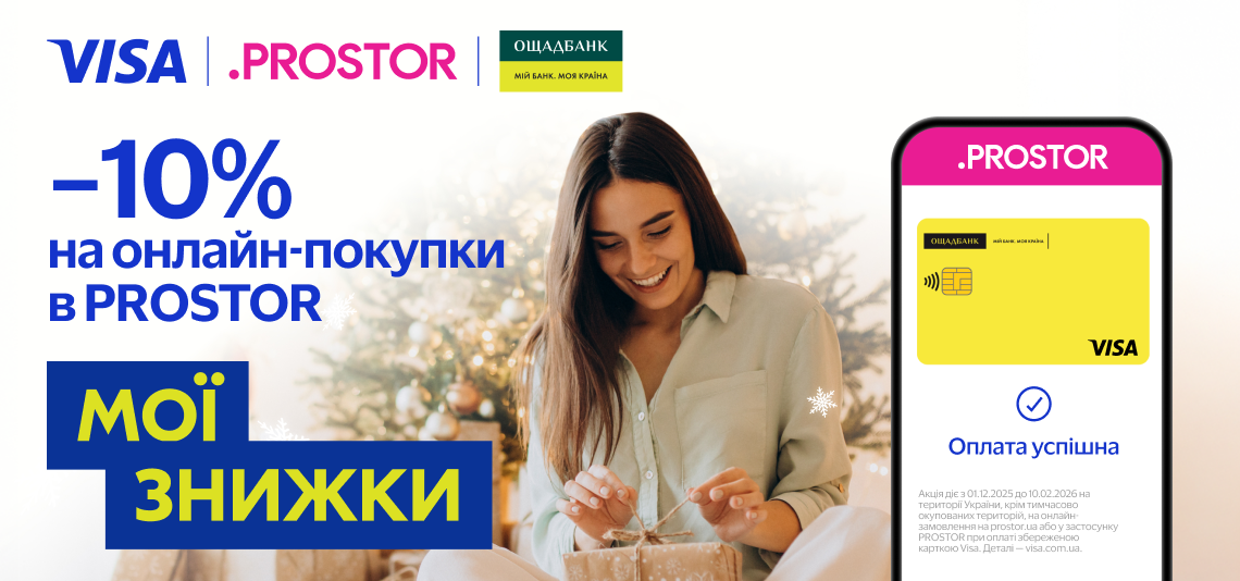 Знижка діє при оплаті товарів PROSTOR на сайті або через застосунок збереженою карткою Visa на території України (крім тимчасово окупованих територій) з 1 грудня 2025 року до 10 лютого 2026 року.