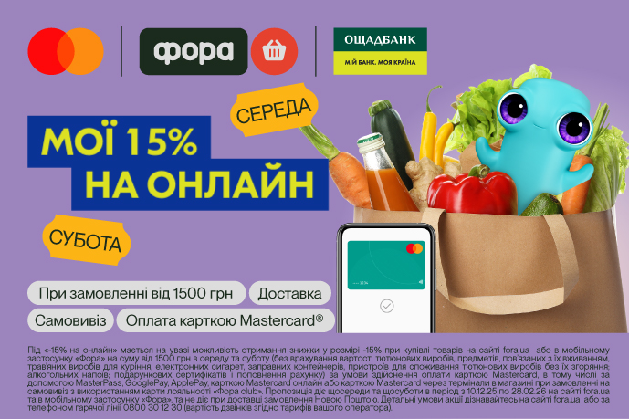 - Зробіть онлайн-замовлення у будь-яку середу або суботу до 28.02.2026 на суму від 1500 грн на сайті fora.ua або в мобільному застосунку «Фора»