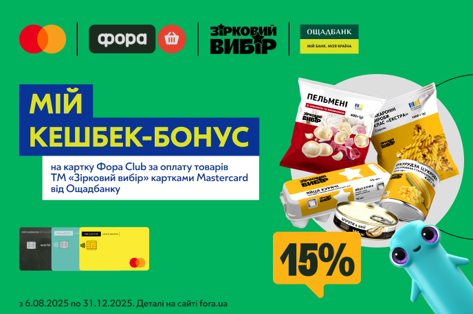 Отримуйте кешбек-бонус у розмірі 15% за розрахунки карткою Мastercard® від Ощадбанку у магазинах «Фора».