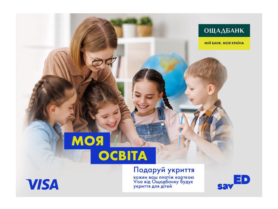 Суть акції: здійснюйте будь-яку трансакцію карткою Visa від Ощаду, а банк спрямує 1 гривню на відбудову навчальних закладів та облаштування бомбосховищ.