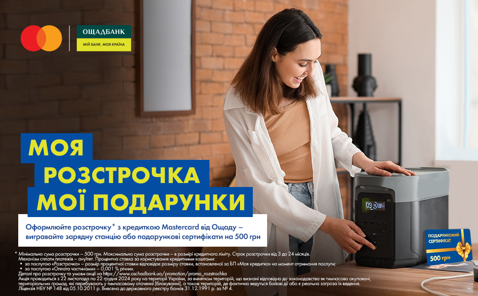 - Оформлюйте розстрочку з кредиткою Mastercard від Ощаду на суму від 500 грн
