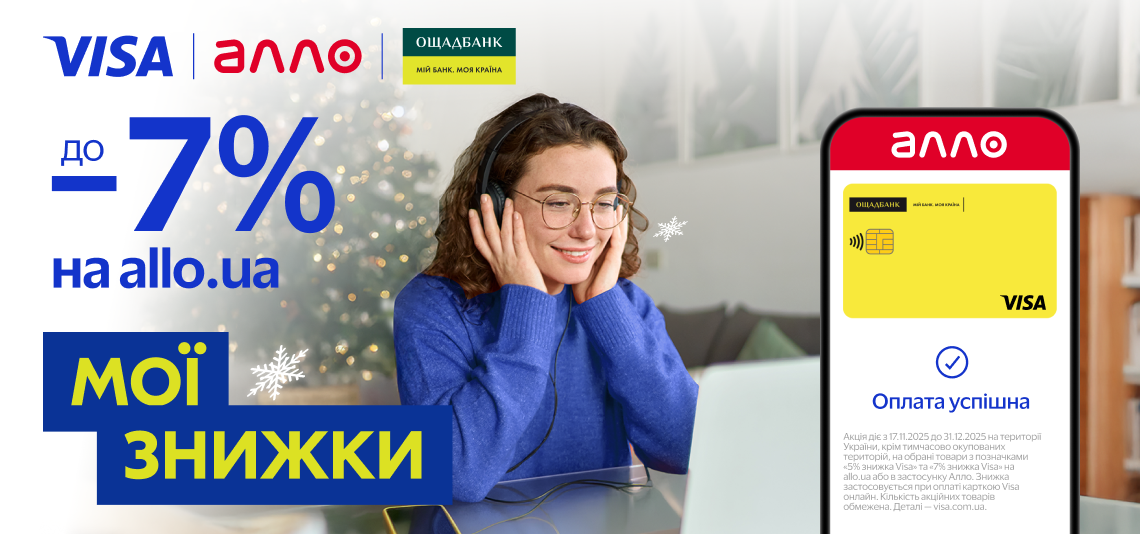 Знижка діє при оплаті акційних товарів на allo.ua або в застосунку карткою Visa на території України (крім тимчасово окупованих територій) з 17 листопада до 31 грудня 2025 року.